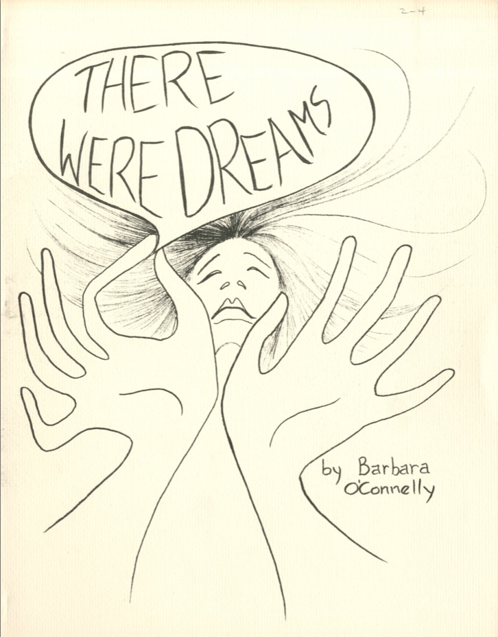 The second series of grOnk was begun in September 1968 and the issues for this series were published irregularly. The fourth issue of the second series features Barbara O’Connelly’s “THERE WERE DREAMS.” The cover is a sheet of 17 x 22″ cream card-stock folded in half; inside are seven individual sheets of cream 8.5 x 11 paper stapled together. Curiously: while the first couple issues of the series were published in 1968, this work by Connelly was printed at Ganglia Press in July 1967. “THERE WERE DREAMS” is a lovely exploration of concrete poetry as a hand-drawn, hand-written art that’s resolutely not of the machinic.