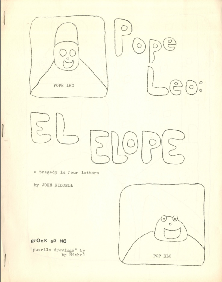 Another publishing curiosity: the sixth issue of the second series was published in 1969, a year earlier than the fifth issue, and featured John Riddell’s “POPE LEO: EL ELOPE” with drawings by bpNichol. This is an early but fascinating work by the Toronto-based John Riddell (whom I’ve written already about here) that is a anagrammatic exploration of the language possibilities inherent in letters ‘p,’ ‘o,’ ‘l,’ and ‘e’ (hence the sub-title, “a tragedy in four letters”) – sometimes using one of the letters twice, sometimes dropping one, always rearranging. It’s a remarkable meshing together of concrete poetry and combinatorial writing practices.