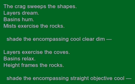 Our reading will also feature game designer and critic Ian Bogost reading from “A Slow Year” – a so-called “chapbook of game poems” that consists of four slow-moving, contemplative, text-free games (“spring”, “summer,” “autumn,” “winter”) for Atari VCS and an accompanying book of related yet separate print-based computer-generated poems. “A Slow Year” joins a growing number of e-literature works that do not contain any text at all but whose inspiration comes at least partly from poetry (in this case, Bogost attempts to translate poetic principles of Imagism into the realm of the videogame). But, aside from the difficult question of what makes a work literary if it contains no text – and one possible answer to this question is that distinctions between genres in the digital are impossible, and so pointless, to maintain – what is there in “A Slow Year” to read or perform? Perhaps Bogost will stand-in as us, as readers/viewers, performing our own interpretative acts to ourselves as we try to make sense of such a work.