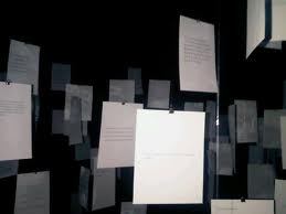 Our reading also highlights those works which strategically nestle themselves between analog and print as a means by which to use print to comment on the digital and the digital to comment on print. A live “reading” of Erin Costello and Aaron Angelo’s site-specific installation and performance “Poemedia” poses many challenges to the conventional notion of a poetry reading as the work originally consisted of one hundred fifty 8.5″ x 11″ sheets of card stock suspended one to eight feet above the ground with live and/or recorded video projected onto the sheets. As Costello and Angelo put it, “Poemedia” asks, “what is the role of poetry, page poetry specifically, in a digitized, information saturated world?” As such, just as “Poemedia” enacts a thinking-through of the state of poetry today that is unavoidably enmeshed in practices of remix, search, and the disintegration of clear boundaries between literary and artistic genres, a reading or performance of it will likely also enact a thinking through of the poetry reading that normally features a single author, reading predictable and supposedly original text.