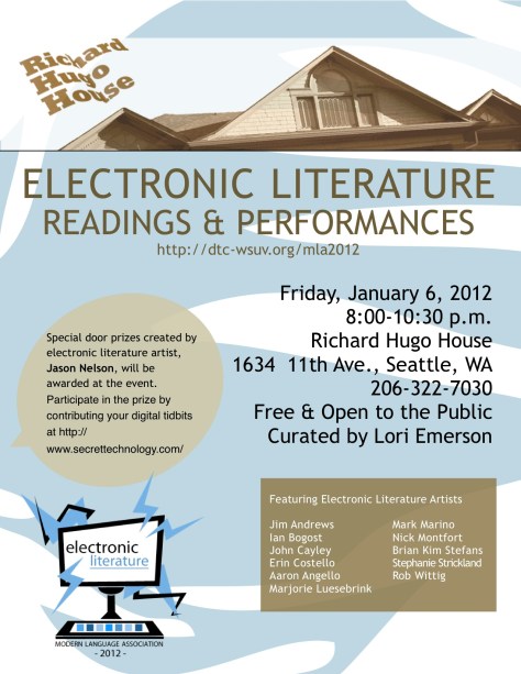 Below is my curatorial statement for the Electronic Literature Exhibit that will take place at the MLA Annual Convention January 2012. Rather than focus my statement on the works I suggested we include in the exhibit, I’ve instead focused on the notion of a reading or performance of e-literature like the one that will take place on Friday January 6th 2012 (8pm Richard Hugo House, Seattle WA).