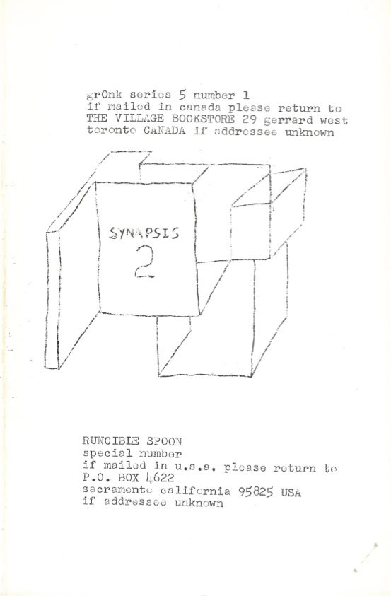 The first issue of the fifth series (pdf here) – also the second issue of the other journal project, synapsis, bp was involved in – is titled the “runcible spoon special CANADIAN international number.” It includes small, typewritten poems and prose by Paul Dutton, Hart Broudy, Nicholas Zurbrugg, Scott Lawrence, Andrew Suknaski, bpNichol, Barry McKinnon, Gary Fogarty, Belgian writer Ivo Vroom, Dezso Huba, and Dave Phillips.
