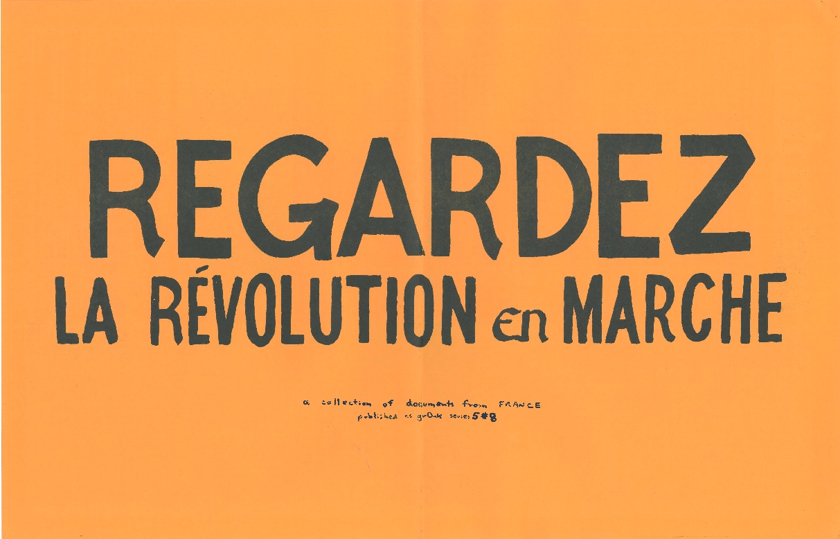 The eighth issue (pdf here), “REGARDEZ LA REVOLUTION en MARCHE: a collection of documents from France” consists of two double-sided sheets of poster-sized paper, folded in half and stapled. It is, I assume, a record of some of the street-based poetry work that was being done throughout 1968 and it includes a fascinating announcement by Juliene Blaine that the “Night and Day Awakeners” have decided “1) to give up the book and its family: record, tape, photograph, film, etc 2) to give up the object and its family: painting, sculpture, machinery, environment, etc 3) to give up the show and its family: theatre, circus, event, happening, etc…and to apply to reality the new methods of transformation formerly situated at the language level.”
