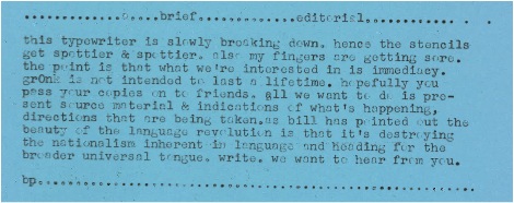 The fifth issue (pdf here) is, as Nichol puts it, “an attempt at integration and keeping in touch…..consisting of this special one shot issue devoted entirely to new notes and featuring excerpts from books mentioned plus a peek at coming attractions.”