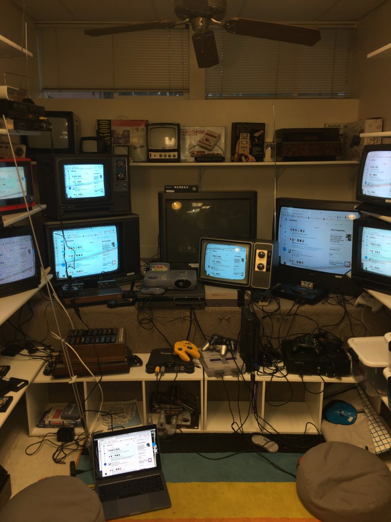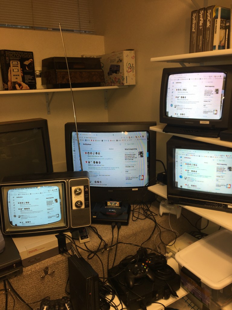 We began by displaying Lori Emerson’s twitter feed on her MacBook Pro laptop. We then connected a USB-C/HDMI cable to an HDMI/Analog video adapter. Next, we connected the cable to the VCR through its AV inputs. The VCR was already connected to the Blonder Tongue modulator via RCA cables which were plugged into the “video/audio in” via an RCA-to-coaxial adapter and an RCA audio splitter. We subsequently set the modulator to channel 8 and FM radio station 88.1. We then plugged the digital TV antenna into the modulator jack “RF out.” Finally, we turned all the televisions on to television channel 8 and broadcast Lori Emerson’s twitter feed.