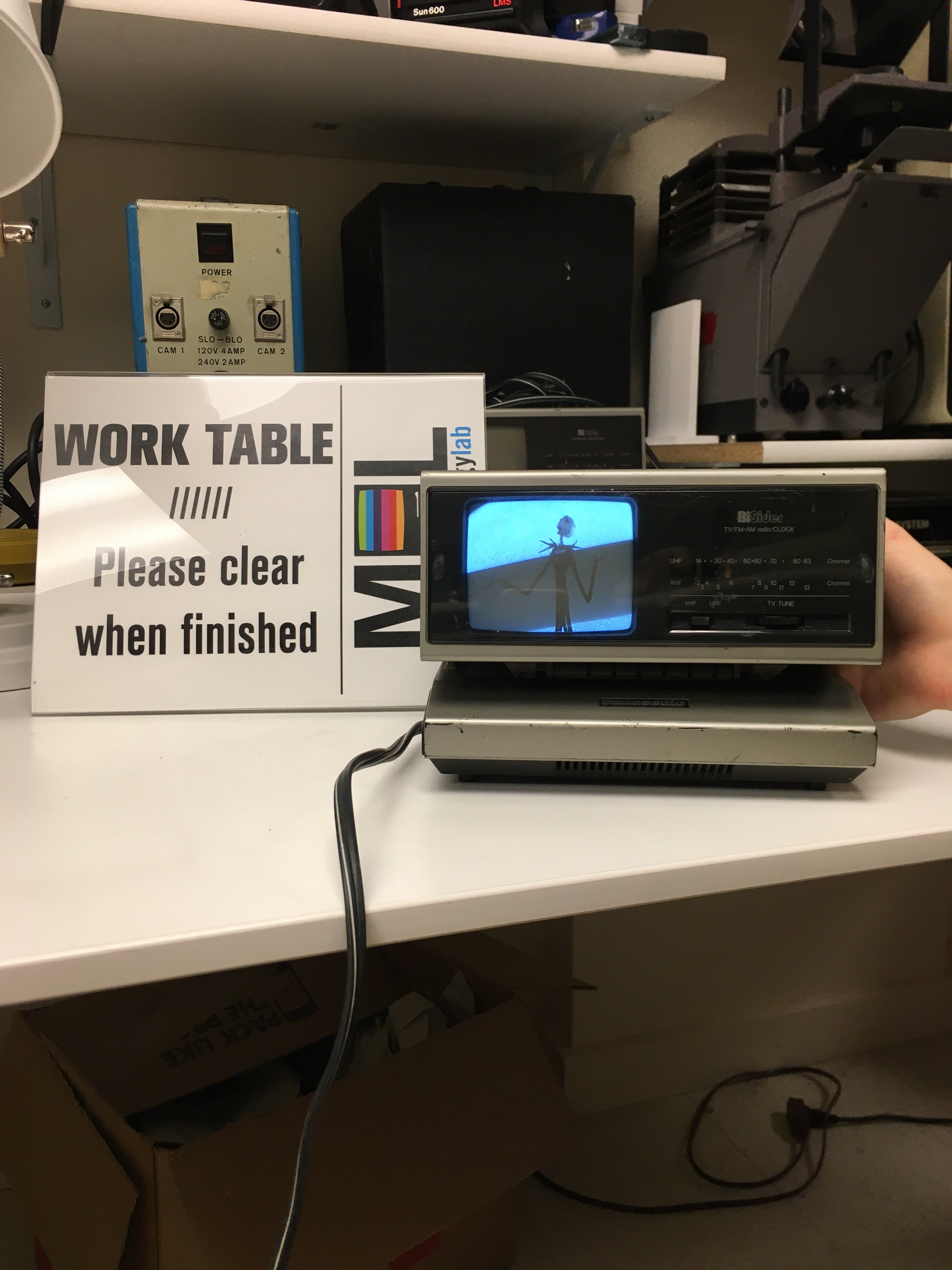 We inserted The Nightmare Before Christmas (1993) VHS tape into the VCR. We then ran an RCA cable from the VCR to the Blonder Tongue modulator, connecting it via the video and audio inputs via the RCA-to-coaxial adapter and RCA audio splitter. We subsequently set the modulator to channel 6 and plugged the antenna into the modulator’s “RF out” jack. Finally, we turned the TV/FM-AM radio/clock on and set it to channel 6 and FM radio station 88.1.