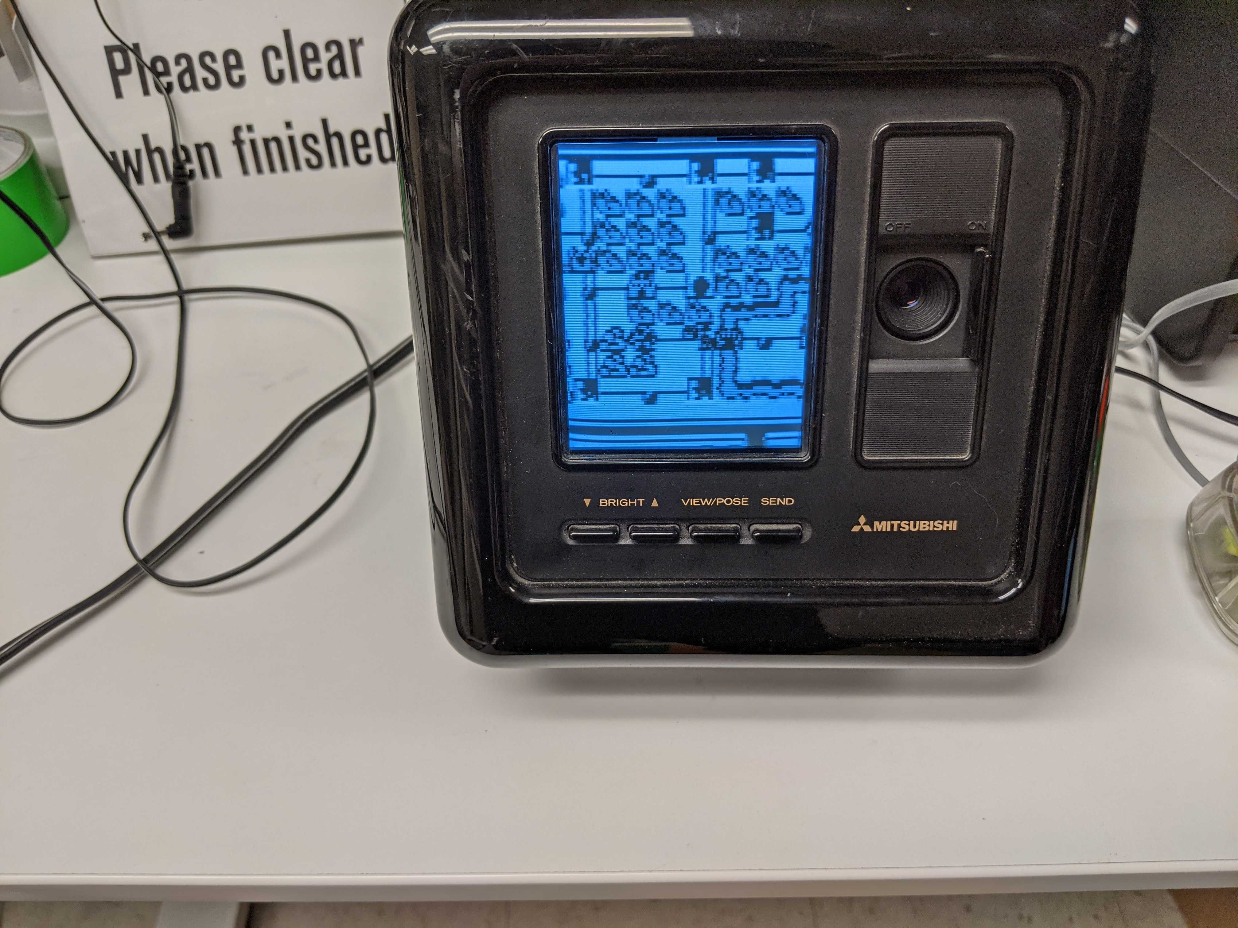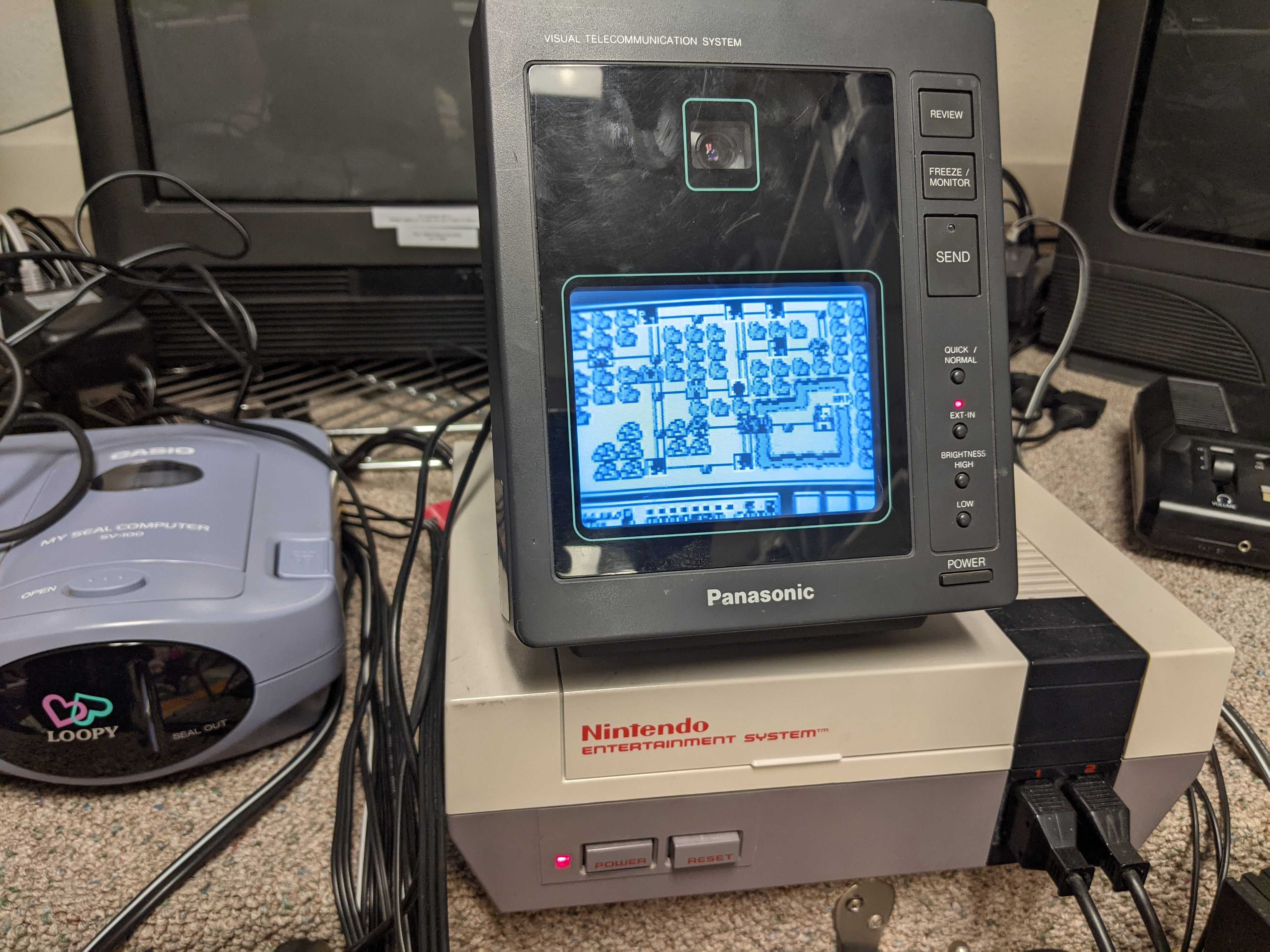 We also hooked the Panasonic up to an NES game console using a standard AV cable with RCA connectors plugged in to “video in” on Panasonic and “video out” on the NES. The Panasonic was also connected to the Mitsubishi via the combination power and RJ-11 cord. We played “Super Mario Bros. 3” using the Panasonic as a display and transmitted images of the game to the Mitsubishi.