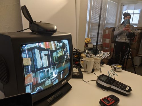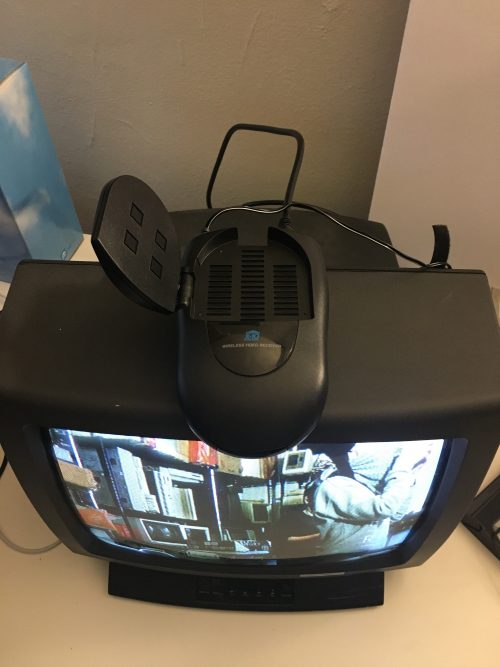Continuing on from “Slow Networks Experiment 1: Over-Air Tranmission,” “Slow Networks Experiments 2 & 3: VHF Radio Transmission,” and “Slow Networks Experiment 4: Videotelephony,” this time we played with a strange and relatively recent entrant to the home security market: the X-10 Wireless video sender which we believe came out in about 1998. This is a puzzling device that enables a kind of very short range over-air transmission and that also…does not seem to work particularly well (a polite way of saying that it seems profoundly wasteful) and would demand that a consumer invest in one device per room since it does not actually seem capable of transmitting through walls, contrary to what it promises to do. According to the manual, the entire kit includes a transmitter base unit which connects to “a DSS receiver and a receiver unit which should connect to a TV in another room. The Video Sender Transmitter converts the A/V signal from your DSS into a radio signal and transmits it (even through walls) to the Video Sender Receiver unit. The Video Sender Receiver converts the signals back to A/V signals which are fed through a cable to your TV’s A/V input jacks.”