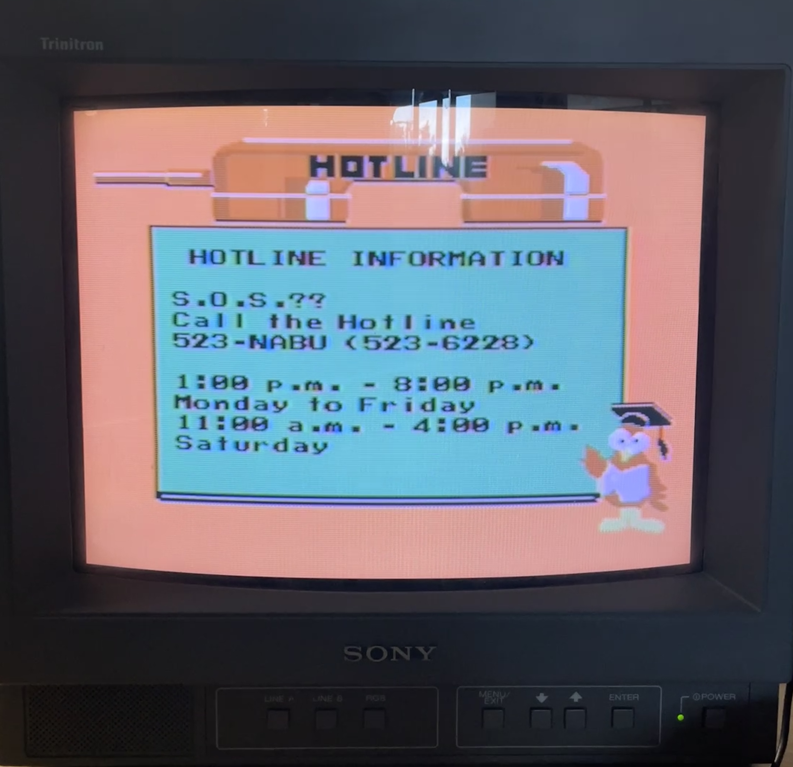 And of course the beautiful, bright simplicity of the menu screens and the pages advertising the NABU hotline you could call if you ever got in a network pickle: